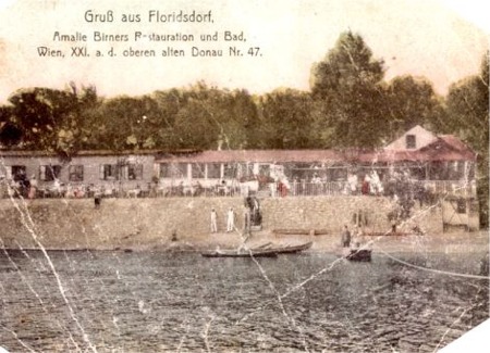 Ansicht des Gastgartens aus dem ehemaligen "4Kreuzer Bad", das damals auch der Familie Birner gehörte. Dieses Bad wurde 1920 von der Gemeinde Wien übernommen und heißt heute Angelibad. Rechts sehen Sie die "Überfuhr". |