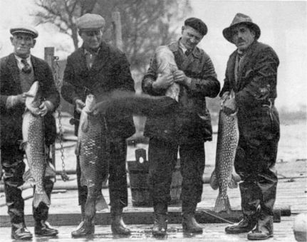 Herr Karl Birner(zweiter von rechts) mit seinen Freunden nach dem erfolgreichen Ausfischen der Alten Donau. Sie sehen: Links und rechts je einen Hecht In der Mitte links einen Karpfen In der Mitte rechts einen Wels |